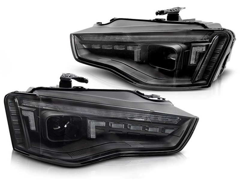 Комплект тунинг фарове за Audi A5 2011-2016 с черна основа, за модела с фабрични DRL светлини, с динамични мигачи, ляв и десен