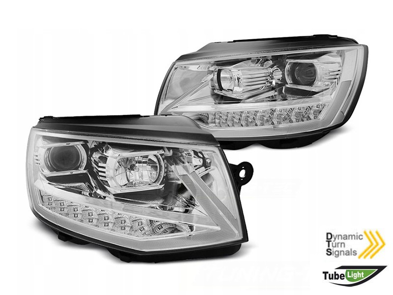 Комплект тунинг фарове за Volkswagen T6 2015-2019 с хром основа за модела без фабрични лед светлини и цокъл H4 на къси светлини, Ляв и десен