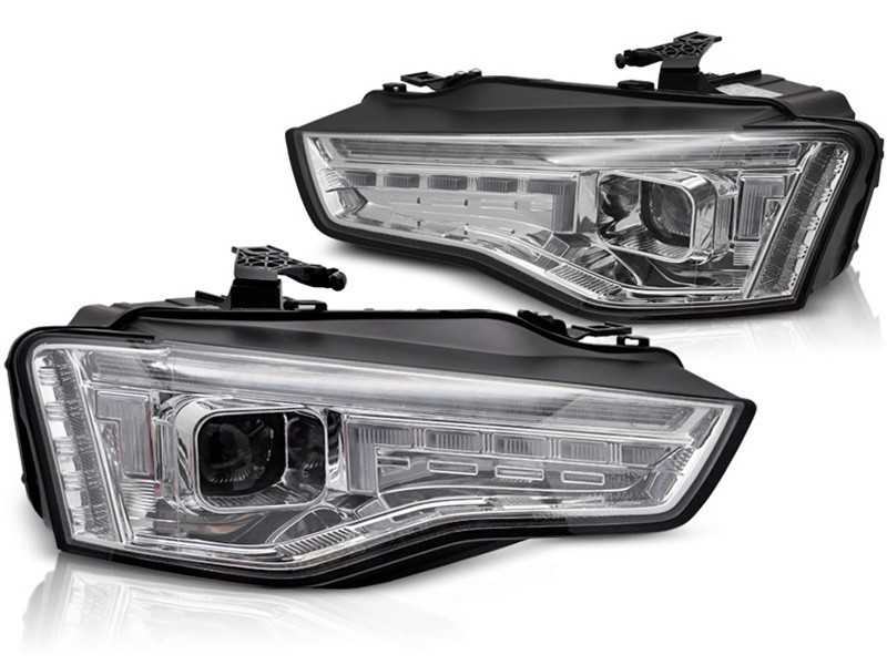 Комплект тунинг LED фарове за Audi A5 2011-2016 с хром основа, за модела с фабрични DRL светлини, с динамични мигачи, ляв и десен
