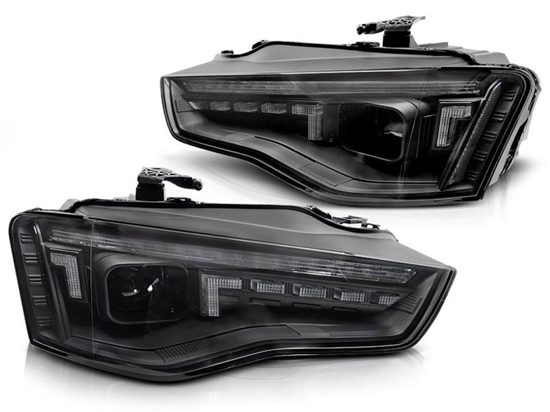 Комплект тунинг LED фарове за Audi A5 2011-2016 с черна основа, за модела с фабрични DRL светлини, с динамични мигачи, ляв и десен