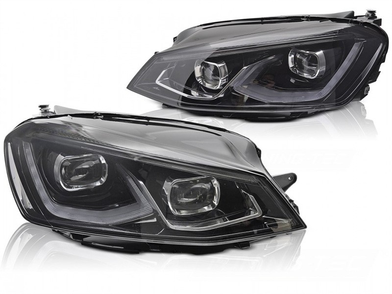 „Комплект LED тунинг фарове за Volkswagen Golf VII хечбек, комби 2013-2019 с черна основа, за модела с фабрични халогенни светлини, с функция „“Посрещане““, ляв и десен“