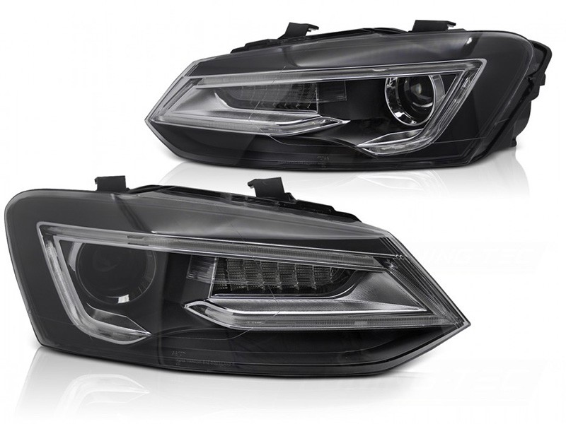 Комплект LED тунинг фарове за Volkswagen Polo 2009-2017 с черна основа, за модела с фабрични халогенни светлини, с динамични мигачи, ляв и десен