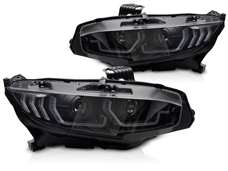 Комплект LED фарове за Honda Civic X 2016-2021 хечбек, седан, купе с черна основа, с динамични мигачи, за модела с фабрични DRL светлини, ляв и десен