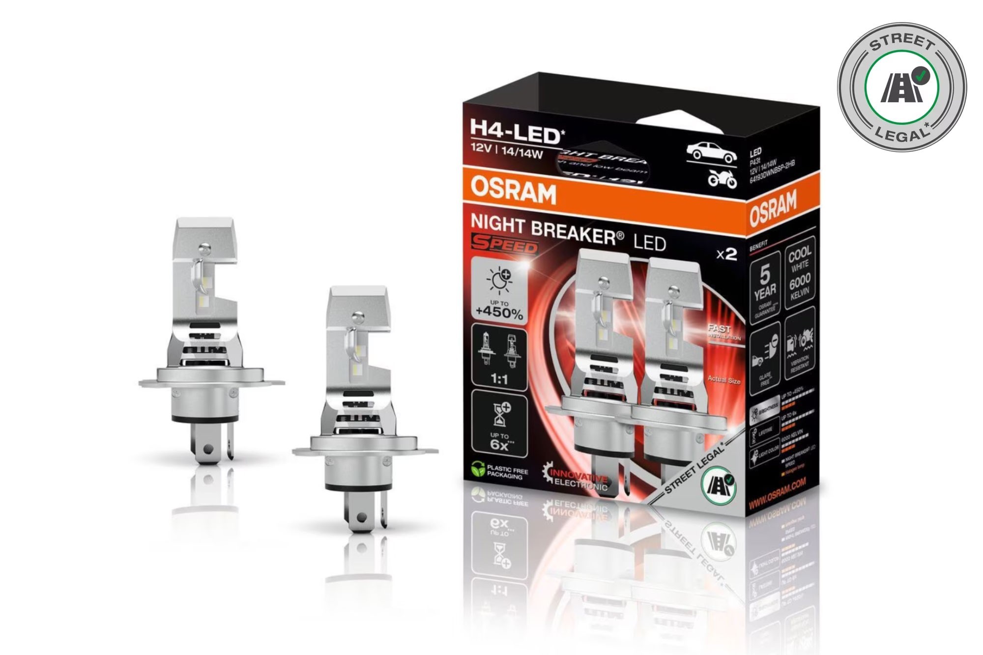 количество за LED система Osram за фарове H4 Night Breaker LED Speed 450 студено бяла светлина, 12V, 14W, 1000/1600lm, 6000K